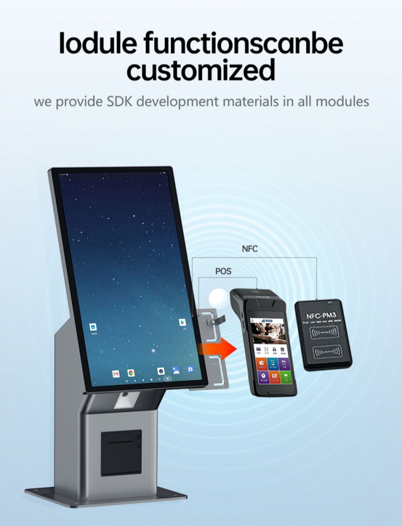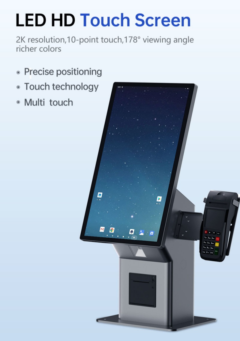 Equipped with a high-definition capacitive touch screen, the kiosk runs on Android OS and integrates easily with POS systems, payment terminals, and third-party software.