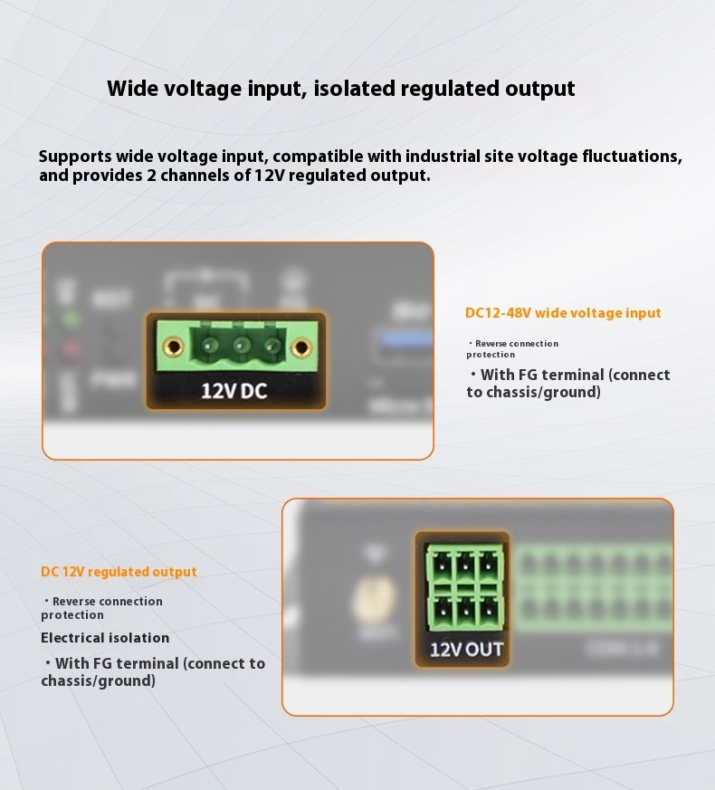 ✅ 12-48V wide voltage input with over-voltage protection — handles industrial power fluctuations
