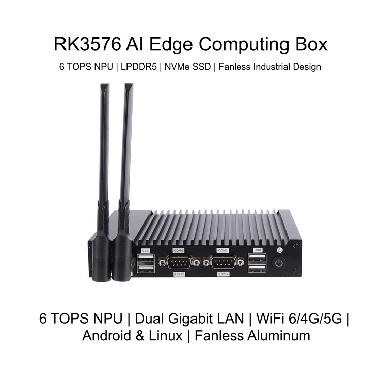 This RK3576 AI Edge Computing Box is an industrial-grade embedded AI computer designed for edge intelligence, machine vision, and AI inference applications. Powered by the Rockchip RK3576 processor with a built-in 6 TOPS NPU, it delivers high-performance AI computing at the edge while maintaining low power consumption.