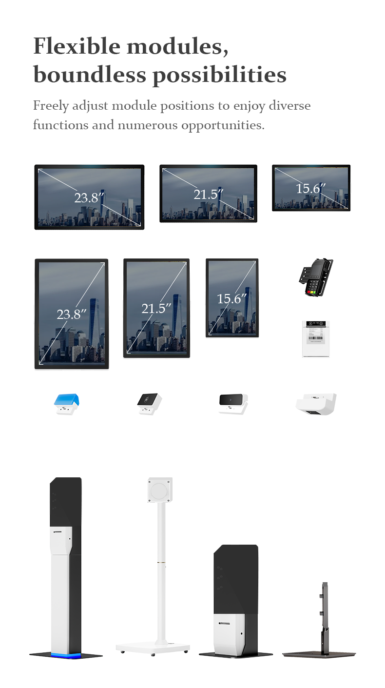 Available in 15.6”, 21.5”, and 23.8” sizes, it supports flexible installation modes including wall-mounted, desktop, and floor-standing.