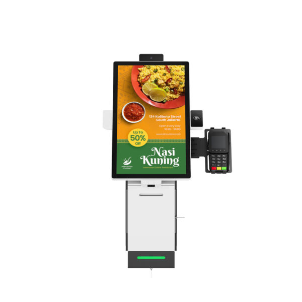 Equipped with a high-definition capacitive touch screen, the kiosk runs on Android OS and integrates easily with POS systems, payment terminals, and third-party software.