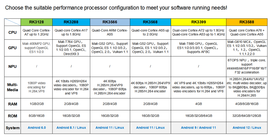 Work with the development team to understand the performance requirements, minimum configuration requirements and recommended configurations of the software. And record the hardware details such as processor speed, memory capacity, hard disk space and graphics processing requirements required by the software. The following is a comparison chart of the popular Rockchip processors specification in the Android based Industrial Tablet PC series for reference.